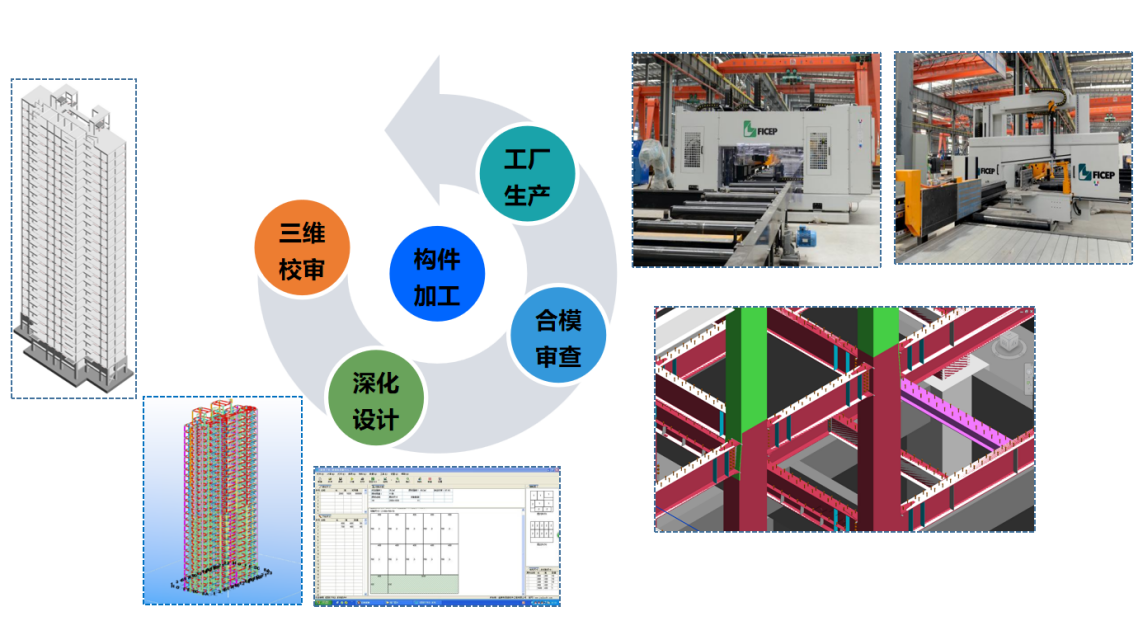 富煌钢构充分发挥BIM作为核心数字化工具的作用,通过三维建模与数据集成,实现了从设计校审、深化设计到工厂加工的全流程信息化管理,大幅提升了设计协同效率与加工精度。通过BIM系统与生产系统的无缝对接,设计数据得以自动转化为生产指令,促进了构件的自动化生产与精准装配,在提升整体效率的同时,也保障了工程质量的标准化与可控性。