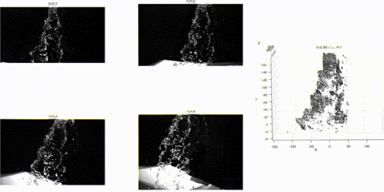 在典型无纹理透明非刚体高速水射流三维形态重建案例中,中科君达视界工程师们使用4台千眼狼高速摄像机同步捕捉水柱表面毛细波、初始破碎点及液滴飞溅,并采用SMART技术成功重建出水柱主体及其边缘破碎产生的液滴三维结构。