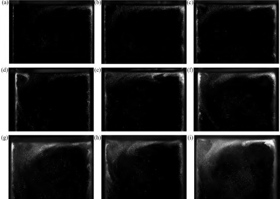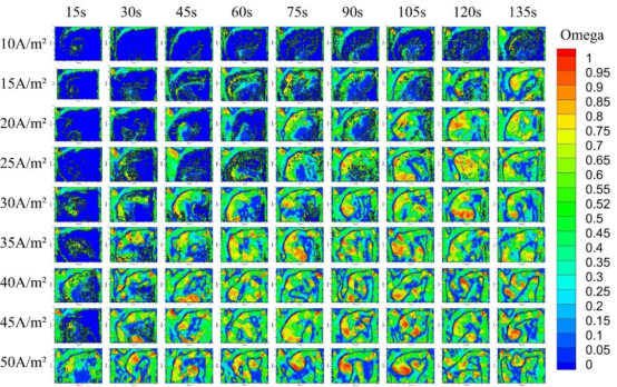 2.2 采用PIV系统连续观测9种不同电流密度下气泡运动,共采集5500帧图像数据,结果显示,随着电流密度增加,电极表面气泡生成速率提升,气泡分布从溶液表层向深层扩展,详见图2。