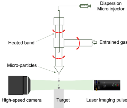 实验设计一套微粒碰撞动态捕捉装置,由颗粒发射系统和速度测量系统组成(图1)。颗粒发射系统选取聚苯乙烯(PS)与二氧化硅(SiO₂)颗粒(粒径50–100 μm)为典型颗粒,分别撞击钼(Mo)和特氟龙(Teflon)靶面。通过调节颗粒速度(0–30 m/s)、粒径及靶材属性,系统性研究COR的动态演变规律。速度测量系统利用位移平台将目标表面和喷嘴精确地对齐在同一轴线上,调整高速摄像机焦距至喷嘴中点,通过调节喷嘴与目标之间距离,实现物理视场尺寸和像素分辨率的优化,确保高速摄像机能准确捕捉颗粒运动轨迹。