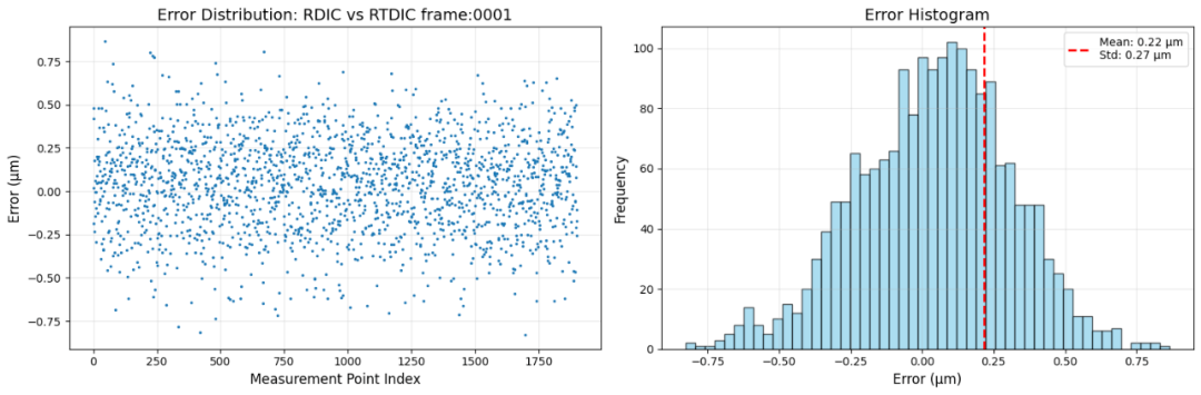 针对这一瓶颈,中科君达视界通过算法架构优化与高性能计算协同,突破了实时计算与测量精度难以兼顾的技术难题。该系统采用高阶灰度插值与并行计算策略,在保证亚像素级测量精度的同时,实现逐帧实时处理与可视化输出。实验表明,该实时DIC系统在4096×3000像素高分辨率下仍可达到每秒20帧以上的处理速度,位移反演平均误差低于1微米。